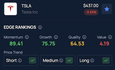 Tesla obtient également un très bon score dans le classement Benzinga’s Edge Stock Rankings pour le Momentum et la Croissance, ce qui reflète de fortes tendances de prix sur des horizons temporels courts, moyens et longs. Plongez dans une analyse complète de l’action, y compris des comparaisons avec ses pairs et concurrents.