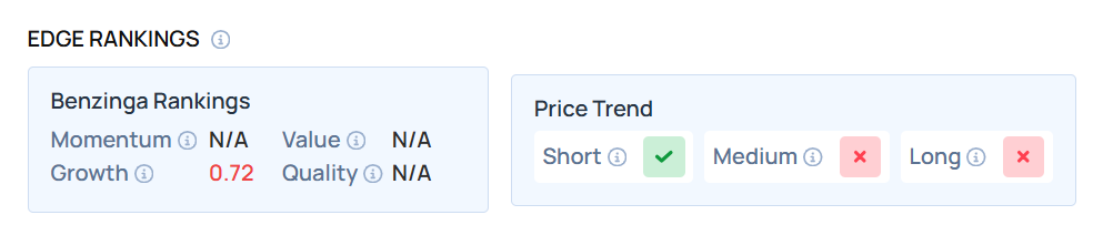 À la date de publication, le titre présentait un score de croissance très faible – une mesure de l’expansion historique combinée du titre en termes de bénéfices et de revenus sur plusieurs périodes. Comment se compare-t-il à Strategy Inc. (NASDAQ:MSTR), le pionnier de la trésorerie en cryptomonnaies ? Rendez-vous sur les classements des actions de Benzinga Edge pour le découvrir.