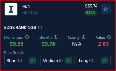 Benzinga Edge Stock Rankings montre qu’IREN a une forte tendance des prix à court, moyen et long terme. Son classement en matière de momentum était élevé au 100e percentile, tandis que son classement en matière de valeur était faible au 3e percentile ; les détails des autres métriques sont disponibles ici.