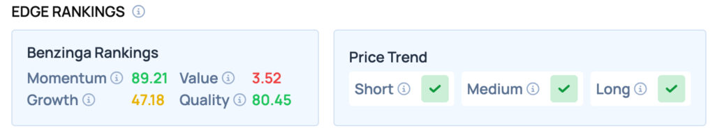 Tesla obtient de bons scores sur les indicateurs Momentum et Quality, tout en offrant une croissance satisfaisante, mais une faible valeur. Tesla présente également une tendance des prix favorable à court, moyen et long terme. Pour d’autres analyses de ce type, inscrivez-vous dès aujourd’hui aux classements d’actions Benzinga Edge !