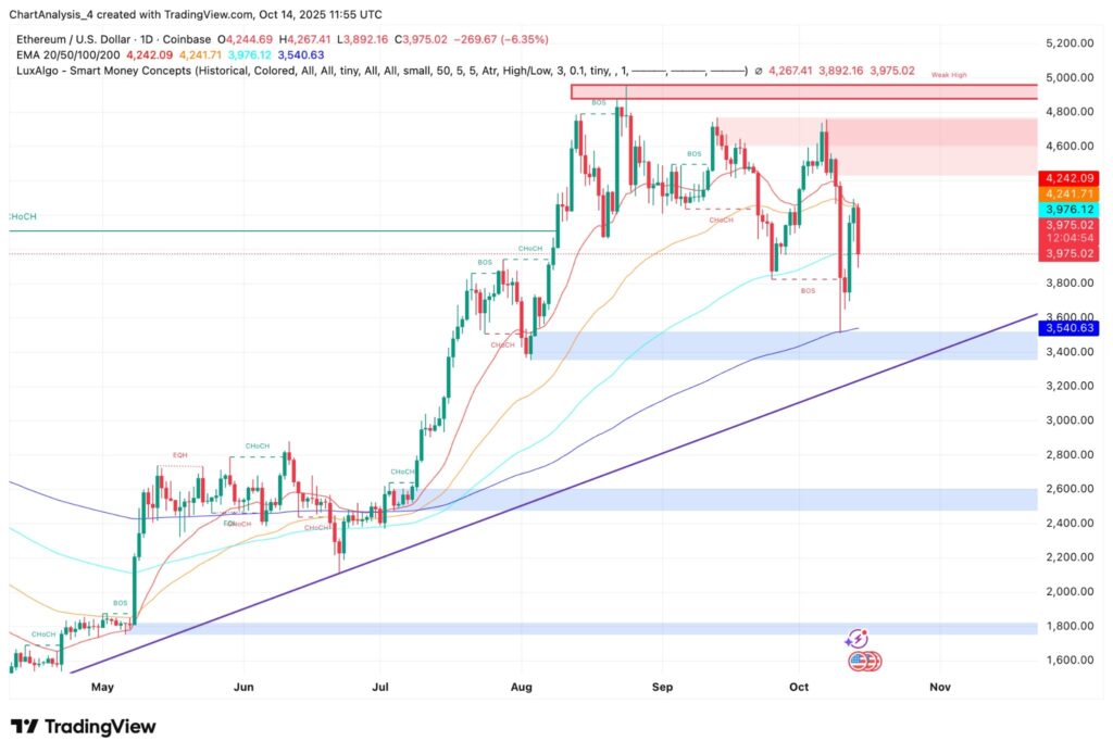 Ethereum est tombé à 3 975 dollars après avoir échoué à maintenir son élan au-dessus de la plage de résistance de 4 600 à 4 800 dollars.