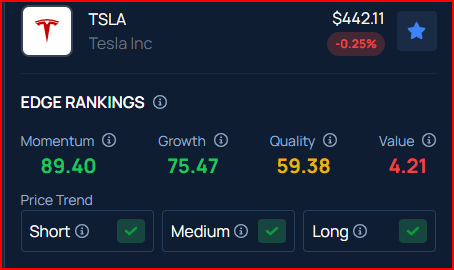 Les classements Edge de Benzinga placent Tesla dans le 59e centile pour la qualité et le 4e centile pour la valeur, ce qui reflète des performances mitigées dans les deux domaines. Consultez le rapport détaillé ici.