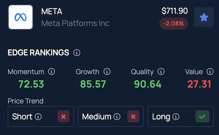 Les classements Edge des actions de Benzinga indiquent que Meta présente une tendance positive des prix à long terme, tout en affichant des tendances négatives à court et moyen terme. Cliquez ici pour une vue détaillée de l’action et de ses performances par rapport à ses pairs et concurrents.