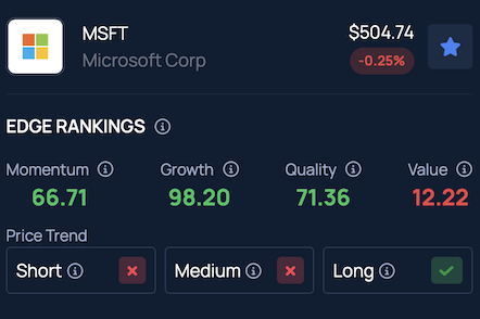 Les classements Edge des actions de Benzinga placent Microsoft au 98e percentile pour la croissance, soulignant ses solides fondamentaux à long terme et la forte confiance des investisseurs. Cliquez ici pour comparer ses performances avec celles de ses pairs de l’industrie.
