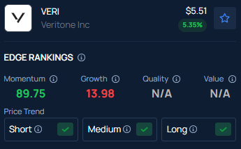 Avec un fort momentum au 89e percentile, les classements Edge Stock de Benzinga indiquent que VERI a une tendance de prix positive sur toutes les périodes de temps. Voici comment se comporte le titre selon d’autres paramètres.
