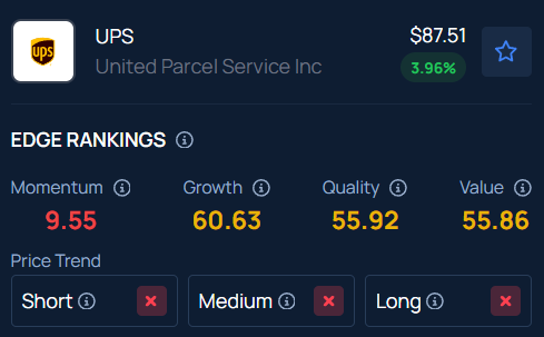Les classements des actions Benzinga Edge indiquent qu’UPS a une tendance de prix négative sur toutes les périodes. Suivez la performance des autres acteurs de ce segment.