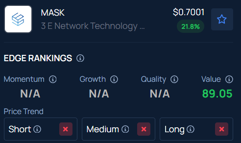 Les classements de Benzinga’s Edge pour le titre MASK indiquent que MASK a un score Valeur de 89,05. Surveillez la performance d’autres entreprises de ce secteur.
