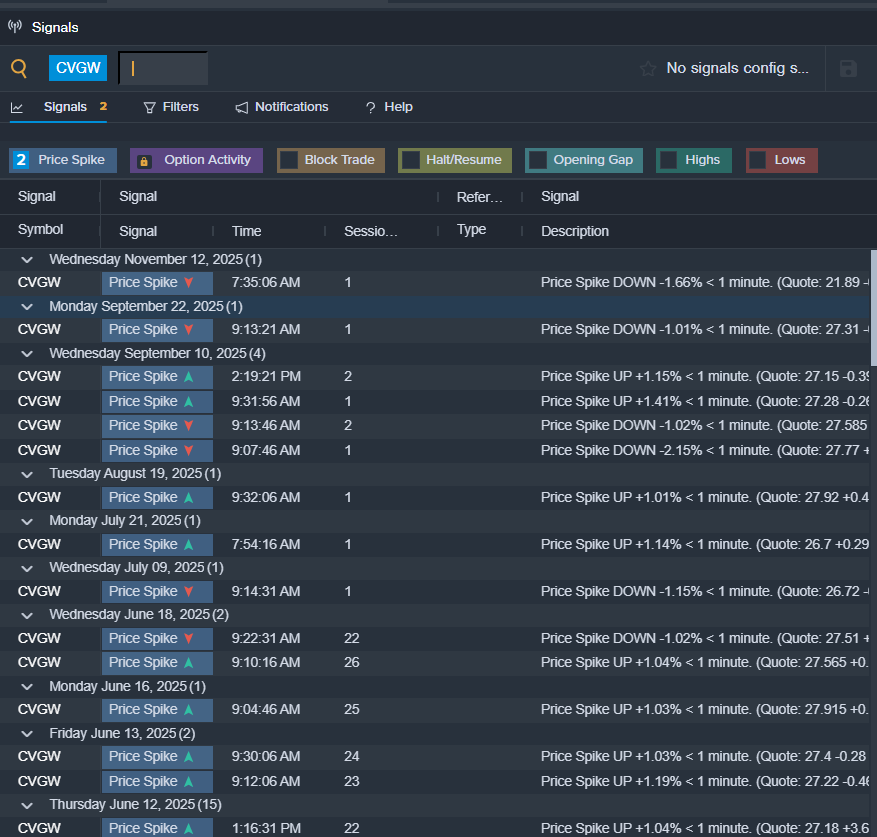 - La fonction de signalisation de Benzinga Pro a averti de la présence d’une cassure potentielle sur le titre CVGW.