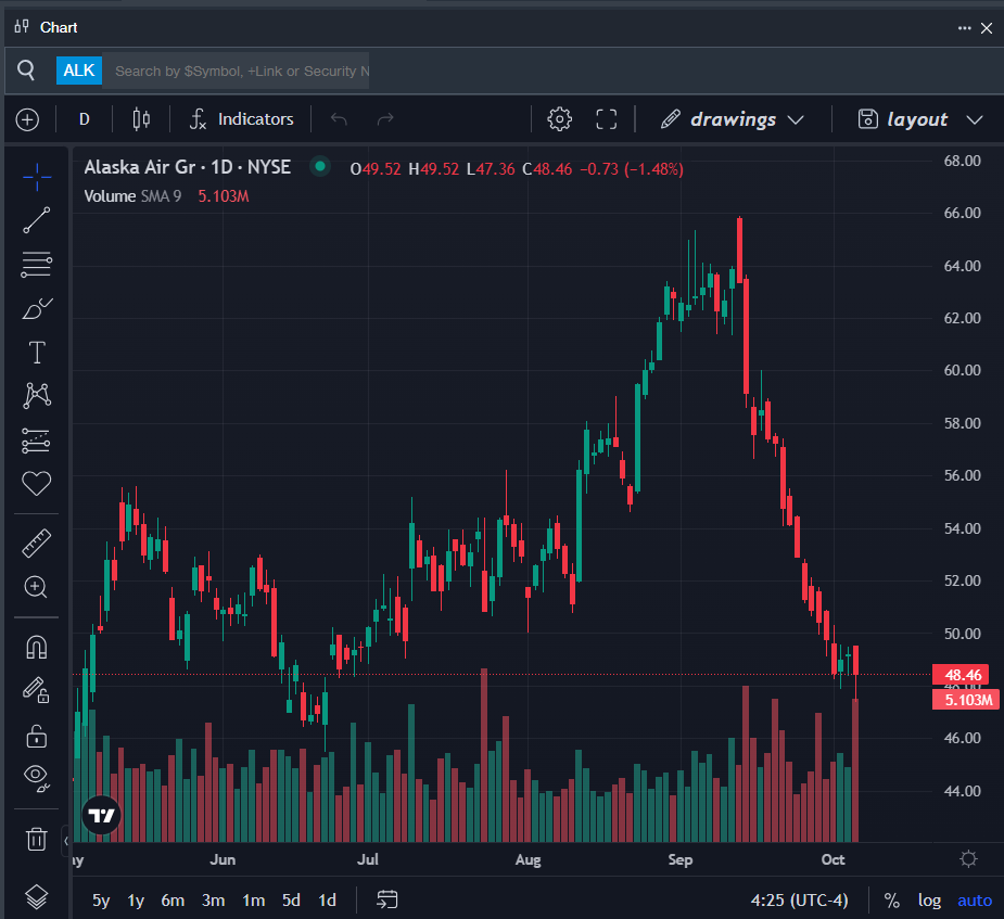 - Action des prix ALK : Les actions d’Alaska Air ont chuté de 1,5 % pour clôturer à 48,46 $ lundi.