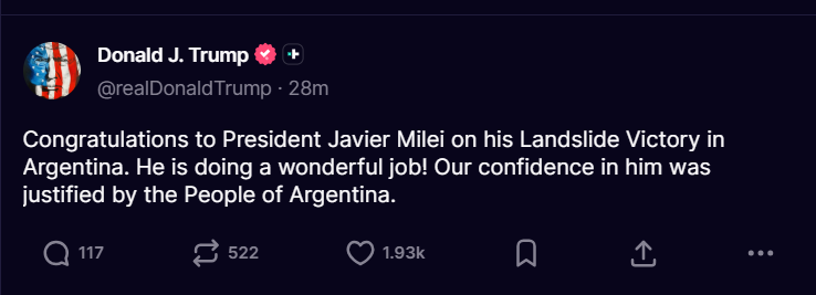 Le président Donald Trump a félicité Milei pour sa victoire via son compte Truth Social, déclarant : « Il fait un travail merveilleux ! Notre confiance en lui a été justifiée par le peuple d’Argentine. »