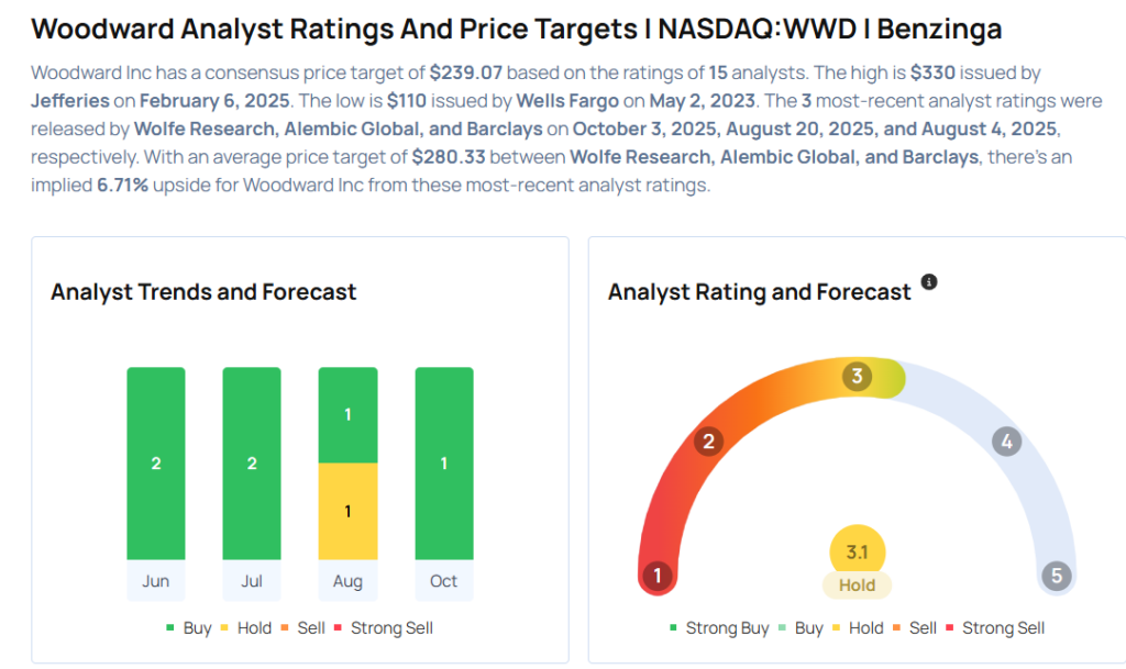 Les analystes s’attendent à ce que la société rapporte un BPA trimestriel de 1,87 dollars, contre 1,41 dollars par action lors de la même période l’année dernière. L’estimation consensuelle pour le chiffre d’affaires trimestriel de Woodward est de 943,15 millions de dollars, contre 854,49 millions de dollars un an plus tôt, selon les données de Benzinga Pro.