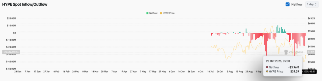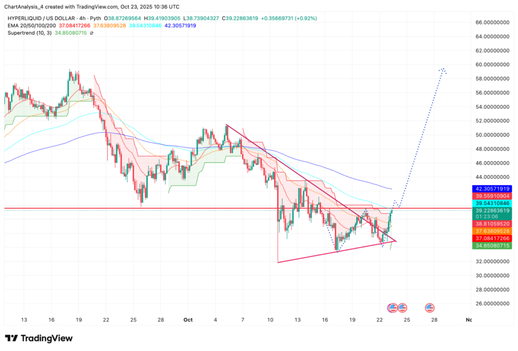Sur le graphique de 4 heures, HYPE est sorti d’un wedge rétrécissant qui limitait le mouvement des prix jusqu’à la mi-octobre.