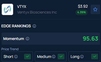 Avec un fort momentum au 95e percentile, le classement Edge Stock de Benzinga indique que le titre VTYX a une tendance de prix positive sur toutes les périodes. Voici comment il se comporte selon d’autres paramètres.