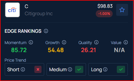 Les classements Benzinga’s Edge placent Citigroup au 26e percentile pour la qualité et au 54e percentile pour la valeur, ce qui reflète sa performance moyenne dans les deux domaines. Consultez le rapport détaillé ici.