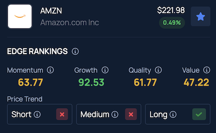 Les classements Edge Stock de Benzinga placent la croissance d’Amazon au 92e percentile, mettant en évidence de fortes tendances de prix à long terme malgré des faiblesses à court et moyen terme. Cliquez ici pour explorer l’action en détail, ainsi que ses pairs et concurrents.